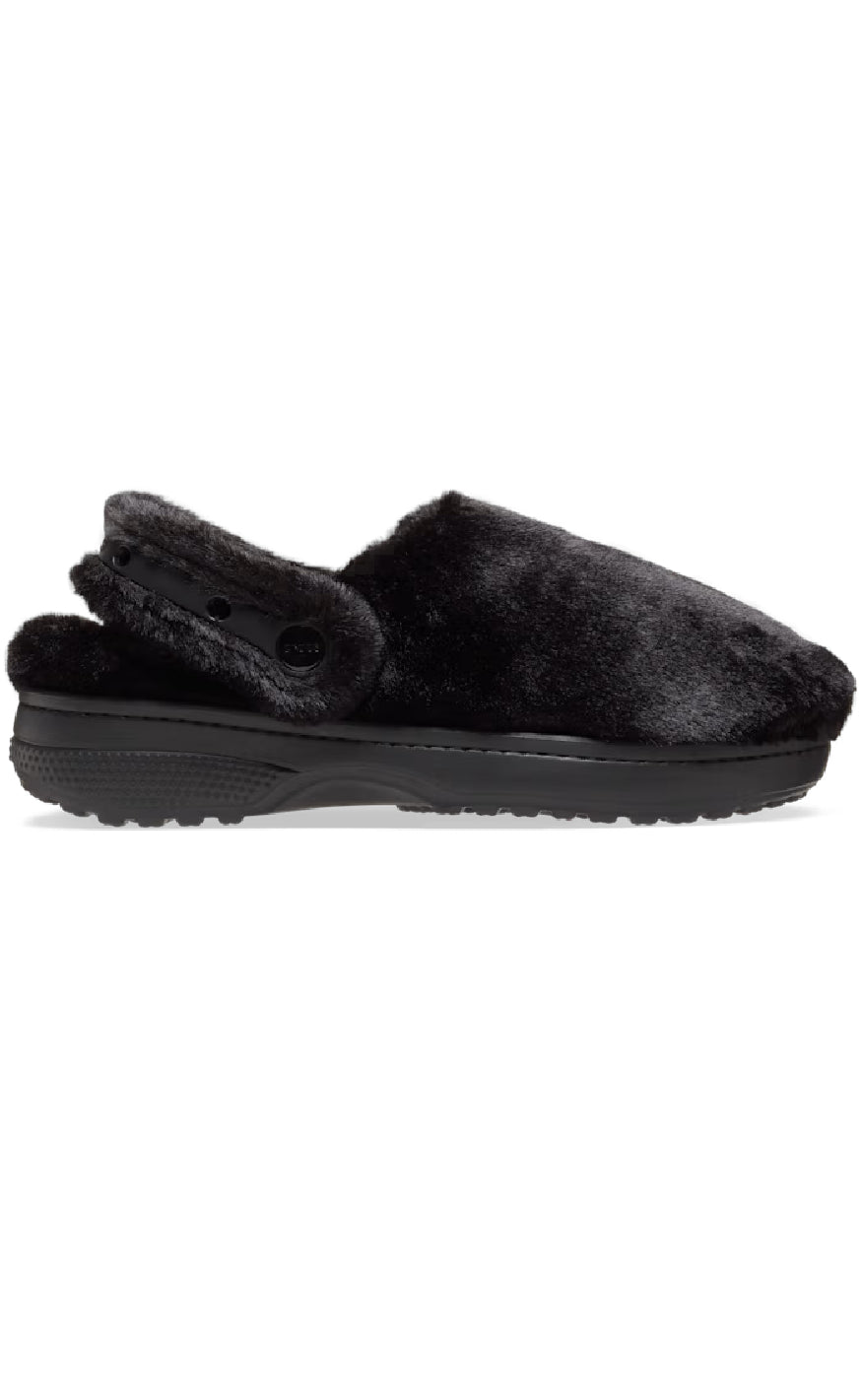 Træsko fra Crocs De klassiske træsko fra Crocs i sort, med plys foroven. Disse lækre sko har lufthuller fortil som gør dem lette og åndbare, samt en strop som holder skoen på plads bagtil.